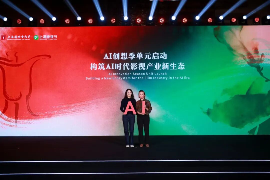 临港新片区管委会商业和文体旅游处副处长张晓燕(左)与上海国际影视节中心副主任童颖(右)共同点亮“AI创想季”单元主题。