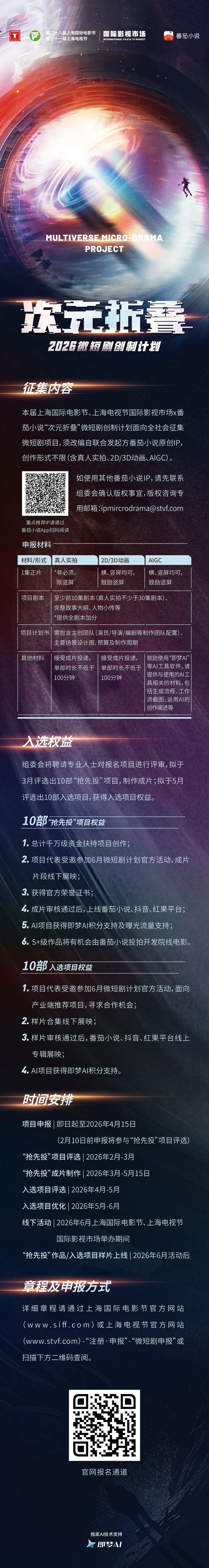 该计划详细章程与报名通道,可访问上海国际电影节官方网站(www.siff.com)或上海电视节官方网站(www.stvf.com),通过“注册·申报”栏目,进入“微短剧申报”通道查阅和报名。